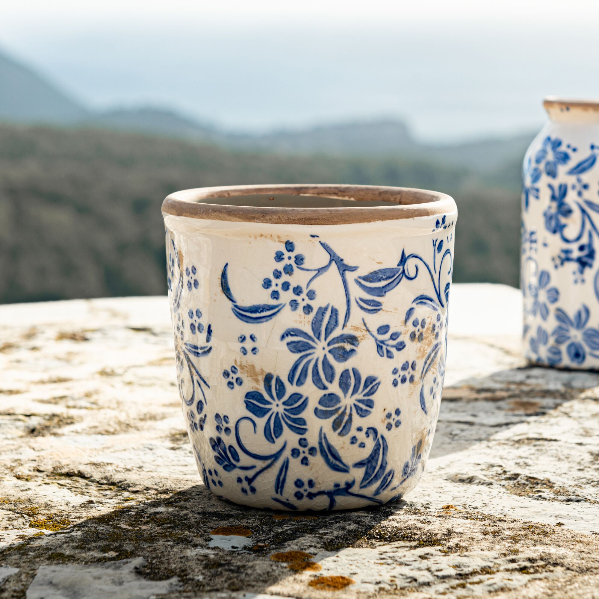 ISADORA - Cache-pot en grès motif fleuri D12,5xH12cm - bleu